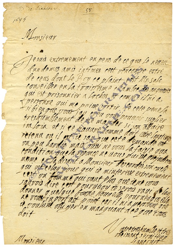 Lettre autographe signéeLettre autographe signée, [adressée à M. de Chavigny]. [1645] ; 1 page in-folio. Il intervient en faveur du neveu d’un de ses amis intimes, qui est « de ceus dont le Roy se plaint », M. Salo, « conseiller en la troisième chambre...