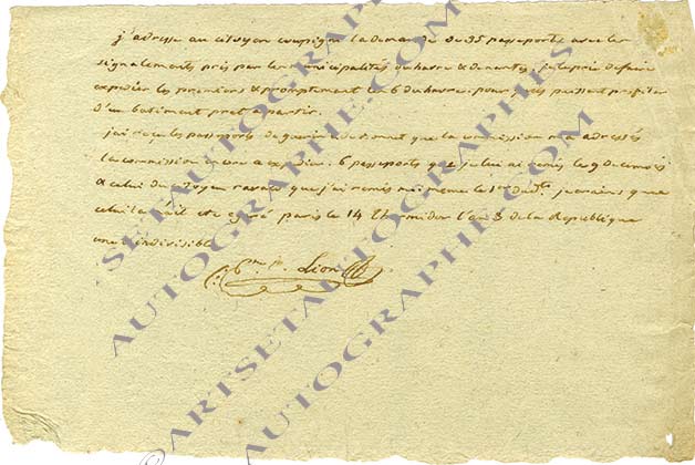 Lettre autographe signéeBillet autographe signé. Paris, 14 thermidor an III [1er aout 1795] ; 1 page in-8° oblongue. Il demande trente-cinq passeports « avec les signalements pris par les municipalités du Havre et de Nantes ». Rare.