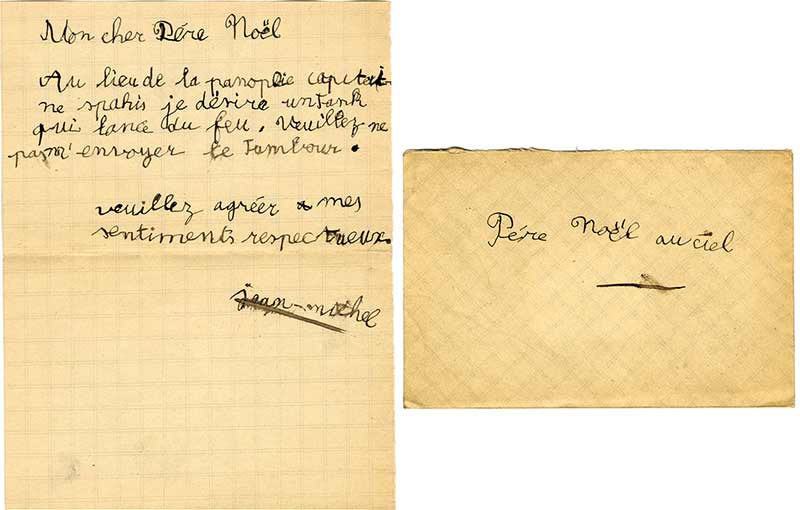Ensemble de 2 lettres, adressées au Père-Noël, signées par « Jean-Michel »Ensemble de 2 lettres, adressées au Père-Noël, signées par « Jean-Michel » :— [1916] ; 1 page in-8° avec enveloppe jointe avec mention autographe « Père Noël au ciel ». « Mon Cher Père-Noël, Au lieu de la panoplie capitaine...