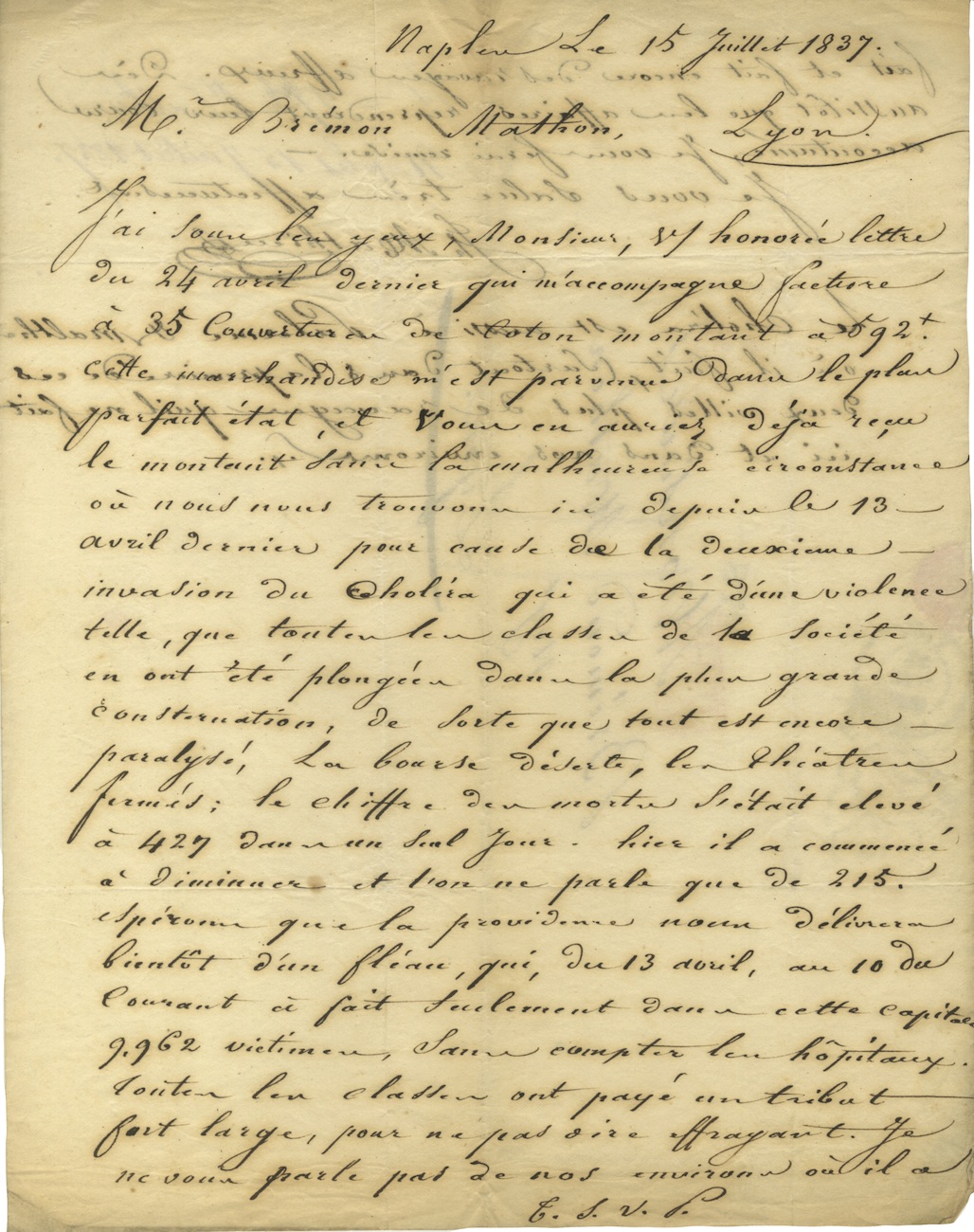 Lettre autographe signéeLettre autographe d’un marchand de Coton à Naples (Mr Mathieu) adressée à son client de Lyon Mr Mathon. Naples, le 15 Juillet 1837 ; 1 pages et demie avec marques postales. ...