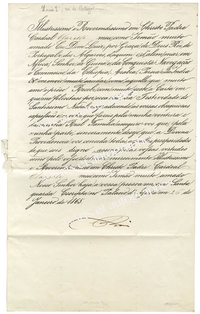 Lettre signéeLettre signée, adressée au cardinal Clarelli. 26 janvier 1865 ; 2/3 page in-folio, en portugais. Adresse et cachets sous papier aux armes.