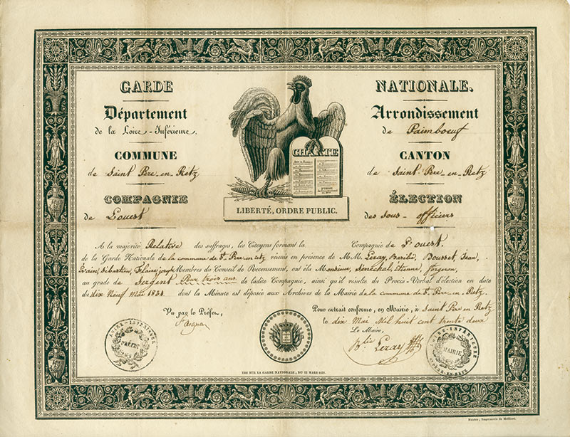 Ordre de nomination au grade de sergent de la garde nationaleOrdre de nomination au grade de sergent de la garde nationale de Saint-Père-en-Retz (Loire-Inférieure). Saint-Père-en-Retz, 10 mai 1832 ; 40 x 32 cm. Très beau diplôme illustré d’un coq tenant la charte de 1830 dans un cadre très...