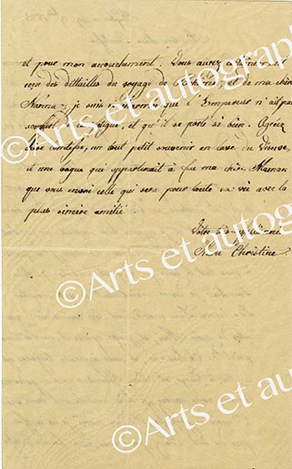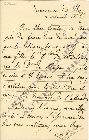 Lettre autographe signéeLettre autographe, signée « A », adressée à un comte. « Trianon ce 25 8bre à minuit et 1/2 » ; 1 page in-8°. « Je vous prie de faire dire de ma part par le télégraphe à Metz à ma fille la Dsse de Wurtemberg que la Dsse de...