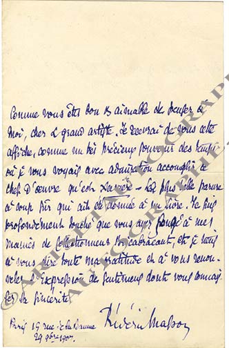 Lettre autographe signéeLettre autographe signée [sans doute adressée à un relieur]. 29 novembre 1907; 1 page in-8°.« Je recevrai de vous cette affiche, comme un très précieux souvenir des temps où je vous voyais avec admiration accomplir ce chef...