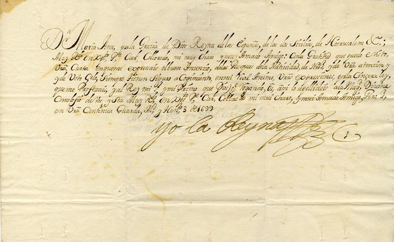 Lettre signéeLettre signée « Yo la Reyna », adressée au cardinal Colloredo. Madrid, 3 janvier 1699 ; 1/2 page grand in-folio, adresse avec sceau aux armes sous papier ; en espagnol. Elle le remercie de ses souhaits pour les fêtes de la Nativité.