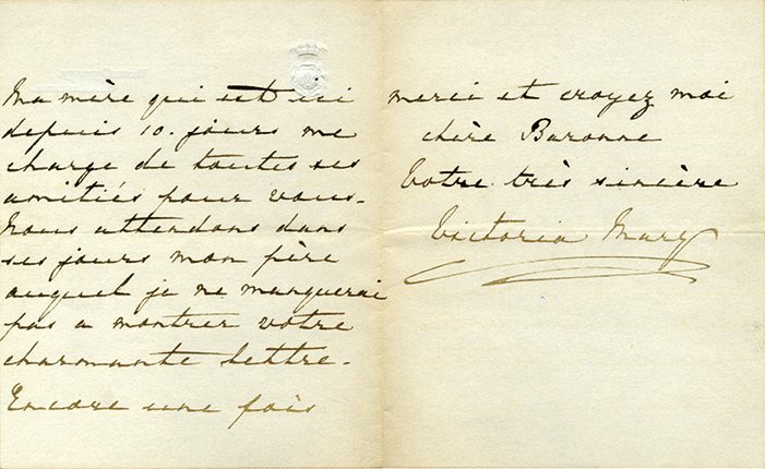 Lettre autographe signéeLettre autographe signée, adressée à une baronne. Sandringham, 15 janvier 1896 ; 2 pages 1/2 in-12, en français. Sur son papier à en-tête gravé à ses initiales avec couronne princière. La princesse la remercie « davoir pensé...