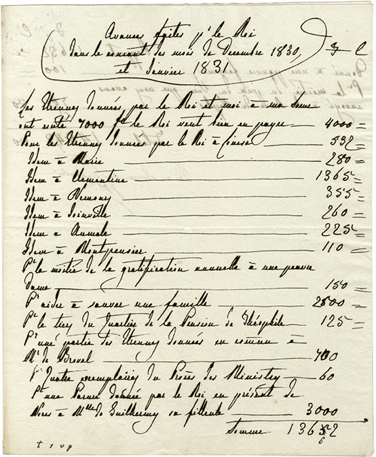 Manuscrit autographeManuscrit autographe, de la main de la Reine. Mémoire des dépenses pour les étrennes. 1830-1831 ; 1 page 1/4 in-4°. « Avances faites par le roi dans le courant du mois de décembre 1830 et janvier 1831 »