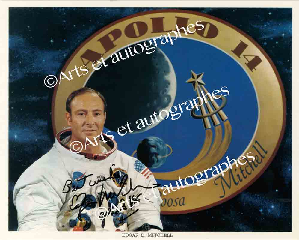 Photographie dédicacéePhotographie dédicacée. 20 x 25 cm. Photographie le représentant en habit d’astronaute devant le sigle d’Apollo 14. « Best wishies. Edgard D Mitchell ».