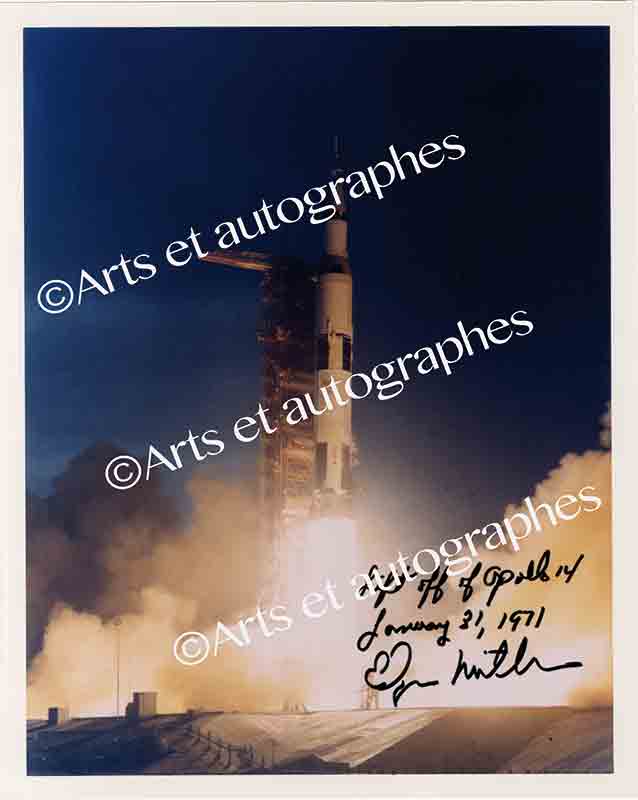 Photographie dédicacéePhotographie dédicacée. Photographie en couleurs représentant Apollo 14 au décollage. 31 janvier 1971 ; 250 x 200 mm. « Lift off of Apollo 14. January 31, 1971. Edgar Mitchell. »