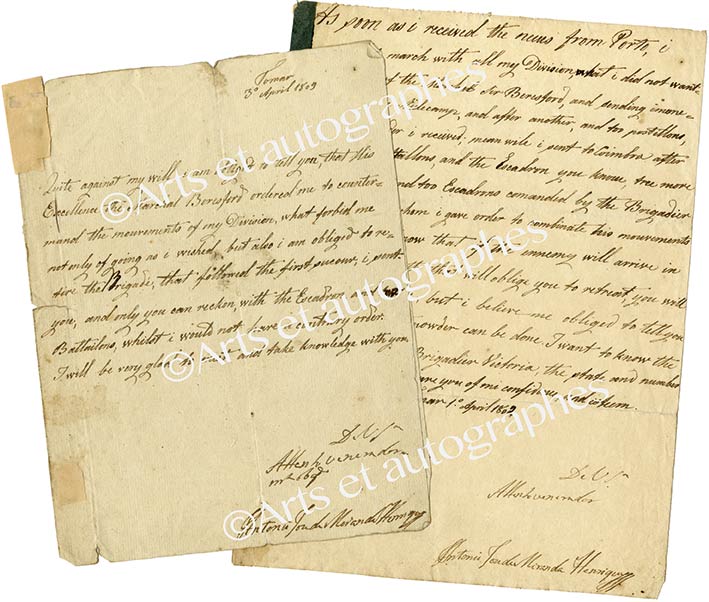 Ensemble de 2 lettres signées sans doute autographesEnsemble de 2 lettres signées sans doute de sa main.— 3 avril 1809 ; 1 page in-4°, trous et fentes ; en anglais. « I am obliged to tell you that His Excellence the marechal Beresford ordered me to counter mand the mouvements of my...
