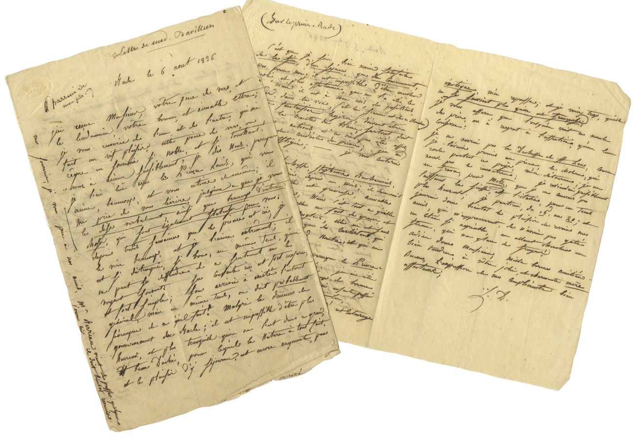 Ensemble de 2 lettres autographes dont une signée de ses initiales2 lettres autographes dont une signée de ses initiales adressées au bonapartiste Louis Belmontet. Bade 6 août et 5 septembre 1836 ; 3 pages in-8° avec adresse et 3 pages in-12°. ...