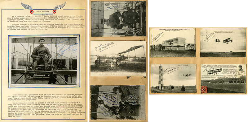 DossierDossier de cartes signées ou de photographies signées par Louis Paulhan.— Une belle photographie le représente dans son biplan, dédicacée à E. Lasalle. 13 X 18 cm.— Une carte signée, le représentant en vainqueur du raid...