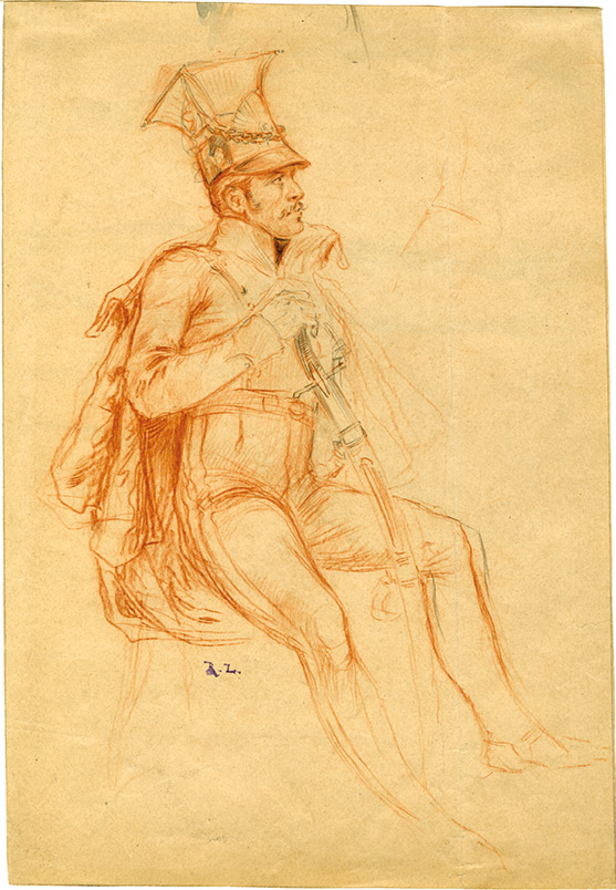 Dessin en sanguine représentant un officier des LanciersDessin en sanguine représentant un officier des Lanciers (peut-être de la Garde Impériale). École française du XIXe siècle.Sur un feuillet 28 x 19 cm, pli vertical.Signé des initiales « R.L. » Alphonse Lalauze[1838-1905],...
