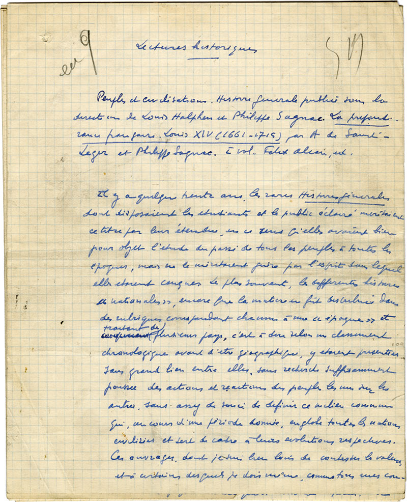 Manuscrit autographe signé et 2 autres manuscritsManuscrit autographe signé « Lectures historiques ». [1935] ; 11 pages in-4° avec corrections.Notes sur des ouvrages venant de paraître : « Peuples et civilisations. Histoire générale publiée sous la direction de Louis Halphen et...