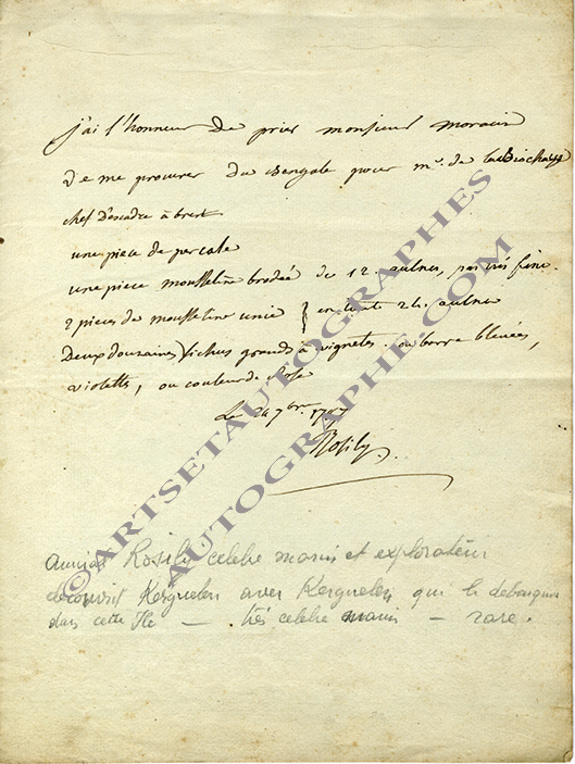 Lettre autographe signéeLettre autographe signée, adressée à M. Morain. 24 septembre 1787 ; 1 page in-4°.« J’ai l’honneur de prier Monsieur Morain de me procurer du bengale pour Monsieur de la Biochaye, chef d’escadre à Brest. Une pièce de percale....