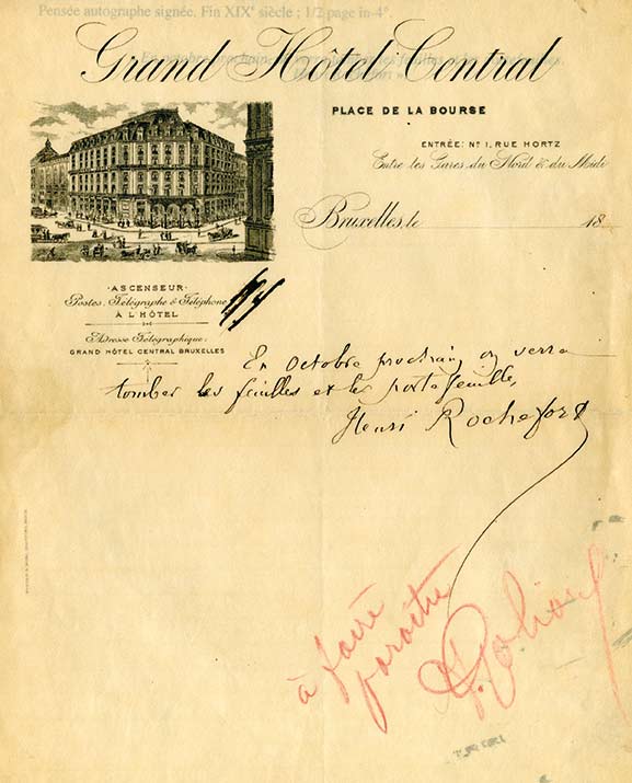 Pensée autographe signéePensée autographe signée. Fin XIXe siècle ; 1/2 page in-4°. En-tête illustré « Grand Hôtel Central ». « En octobre prochain, on verra tomber les feuilles et les portefeuilles. Henri Rochefort ».