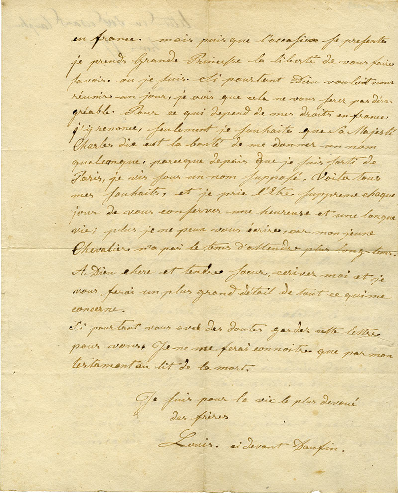 Lettre autographe signéeLettre autographe signée, adressée à la duchesse d’Angoulême. 10 avril 1828 ; 3 pages in-4°. Il raconte sa prétendue histoire depuis l’enlèvement de la prison du Temple, véritable première version de ses mémoires qui furent...