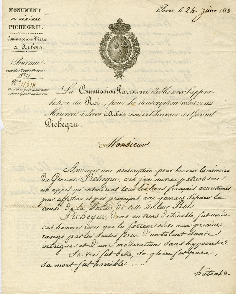 Ensemble de 3 documents sur-Ensemble de 3 documents datés de 1823, concernant la construction d’un monument en l’honneur de Pichegru à Arbois : état nominatif des officiers de la garnison de Rocroy qui ont participé à la souscription pour l’érection d’un...