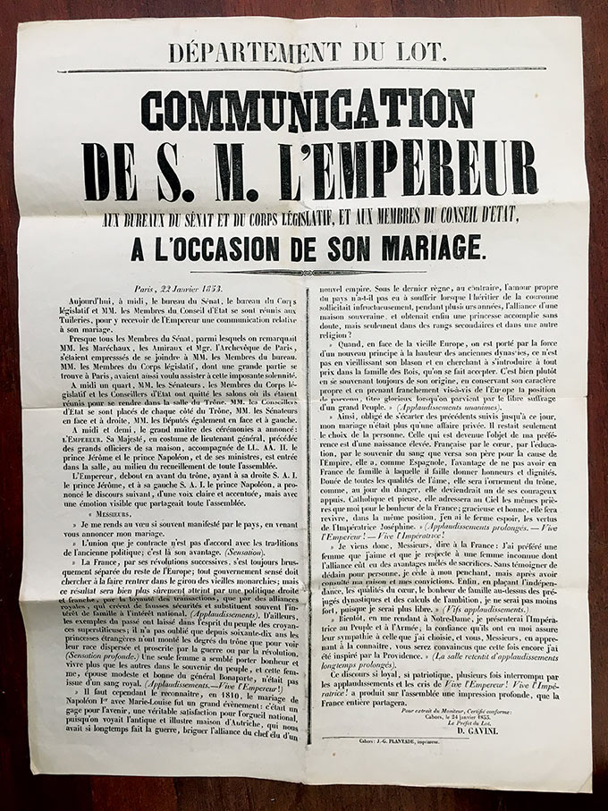 AfficheAffiche. « Communication de S.M. l'Empereur aux bureaux du Sénat et du Corps Législatif, et aux membres du conseil d'État à l'occasion de son mariage ». Paris, 22 janvier 1853 ; 65 x 47 cm. Affiche annonçant son mariage.