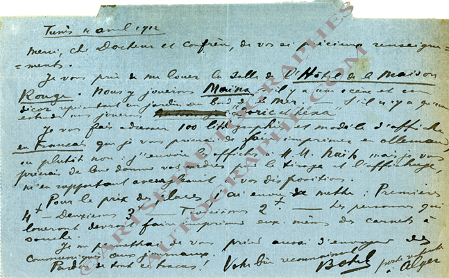 Lettre autographe signéeLettre autographe signée, adressée à un docteur et confrère. Tunis, poste restante, 4 avril 1912 ; 1 page in-4° oblongue. « Je vous prie de me louer la salle de l’Hôtel de la Maison Rouge. Nous y jouerons Maina s’il y a une...