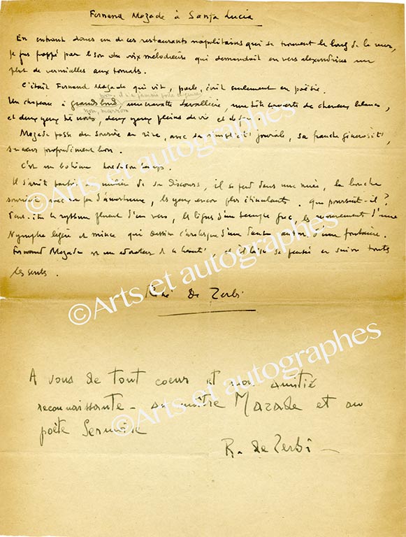 Lettre autographe signéeLettre autographe signée « René de Zerbi », adressée au poète F. Mazade. Lettre non datée ; 1 page in-4°. Bosco fait des éloges de Fernand Mazade. « Mazade passe du sourire au rire, avec sa simplicité joviale, franche...