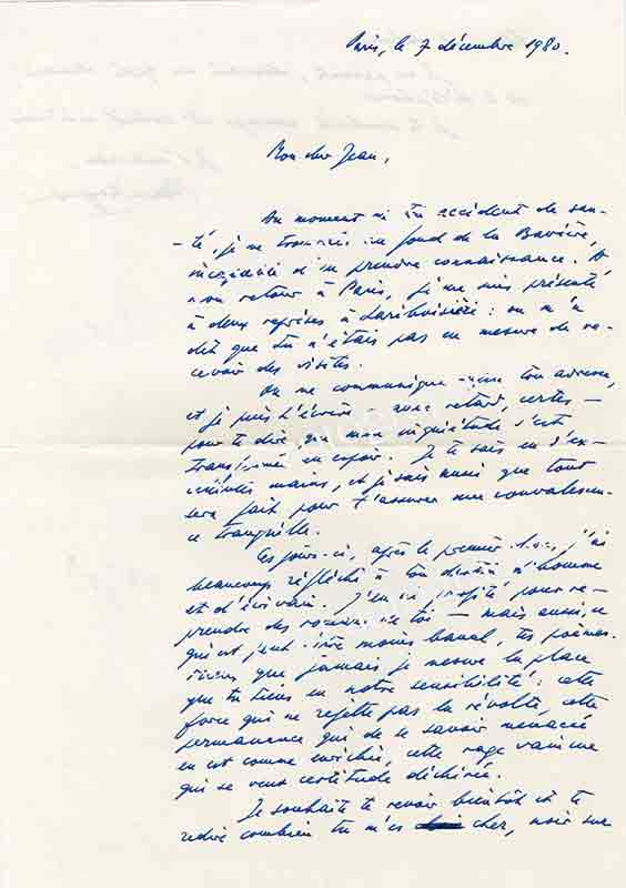 Lettre autographe signéeLettre autographe signée, adressée à Luc Estang. Paris, 7 mars 1971 ; 1 page in-4°, enveloppe jointe.« Trois jours d’absence. Je reviens à l’instant et trouve votre admirable poème ; c’est plus qu’un art poétique : un art...
