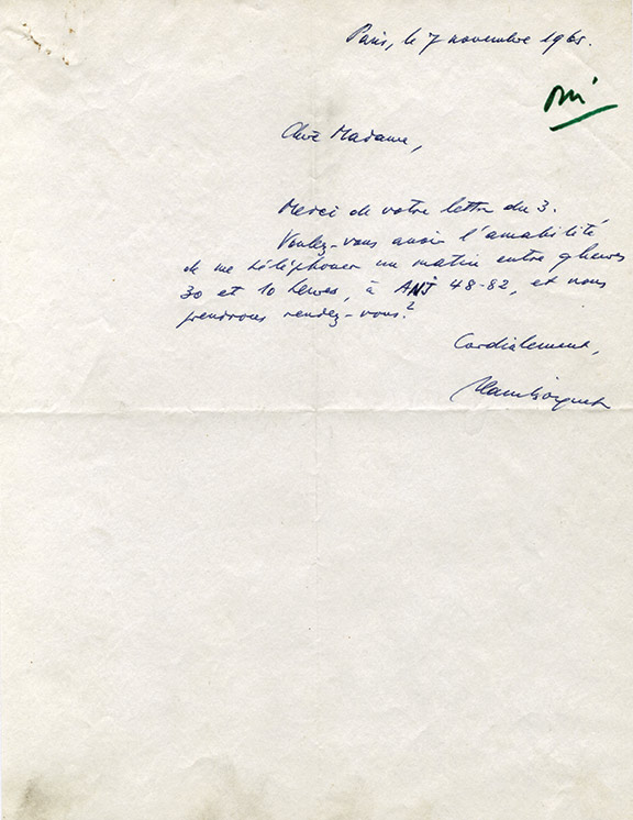 Lettre autographe signéeLettre autographe signée, adressée adressée à Mme Luce Fieschi, éditrice aux Éditions du Club de l'Honnête Homme. Paris, 7 novembre 1965 ; 1/2 page in-4°....