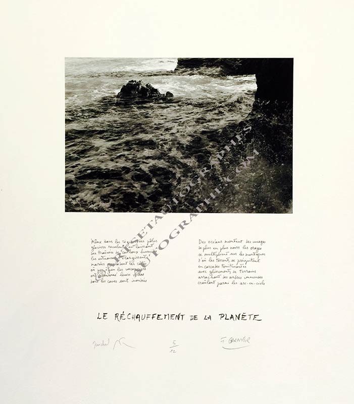 Poème autographe signéPoème autographe signé « Le réchauffement de la planète », écrit à l’encre de Chine avec un stylo Rotring sur page d’Arches, sous une photographie originale de François Garnier. 2003 ; 50 x 42 cm; 12 exemplaires numérotés...