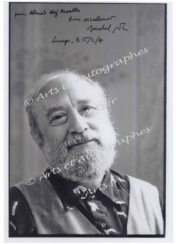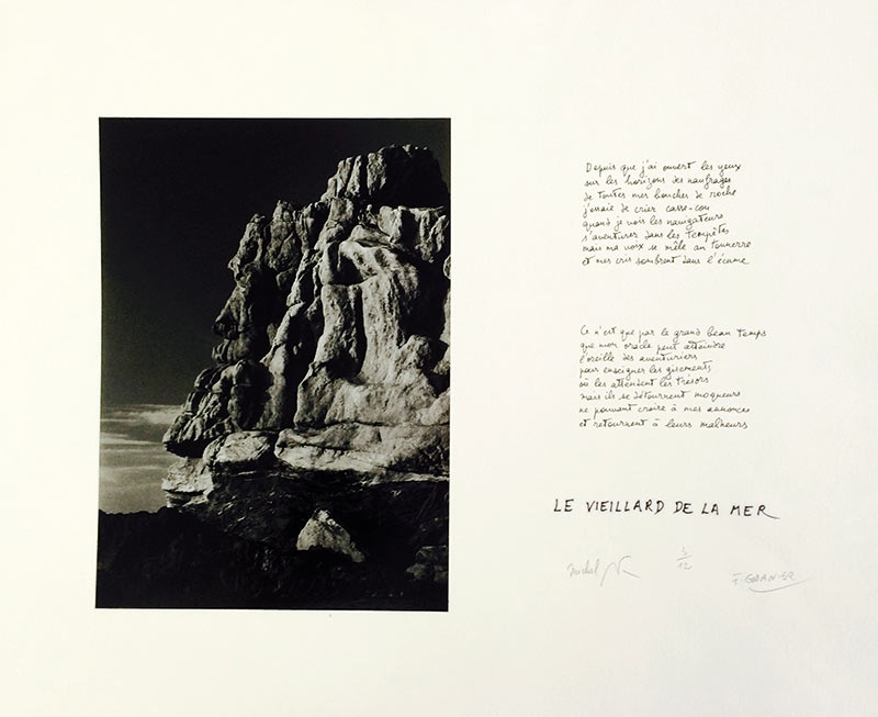 Poème autographe signéPoème autographe signé « Le Vieillard de la mer », illustré d’une photographie de François Garnier. 2003 ; 42 x 50 cm; 12 exemplaires numérotés (3/12). Signature de Michel Butor et François Garnier.« Depuis que j’ai ouvert...
