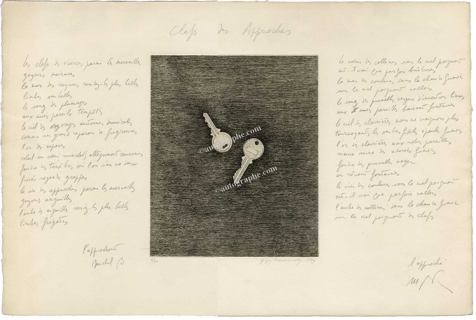 Ensemble de manuscrits autographes signésEnsemble de 3 manuscrits autographes signés entourant des gravures numérotées et signées par Masurovsky, 1973. 2 grandes feuilles 565 X 380 mm avec titre « Clefs des Approches » avec, sur chaque feuille, des poèmes différents....