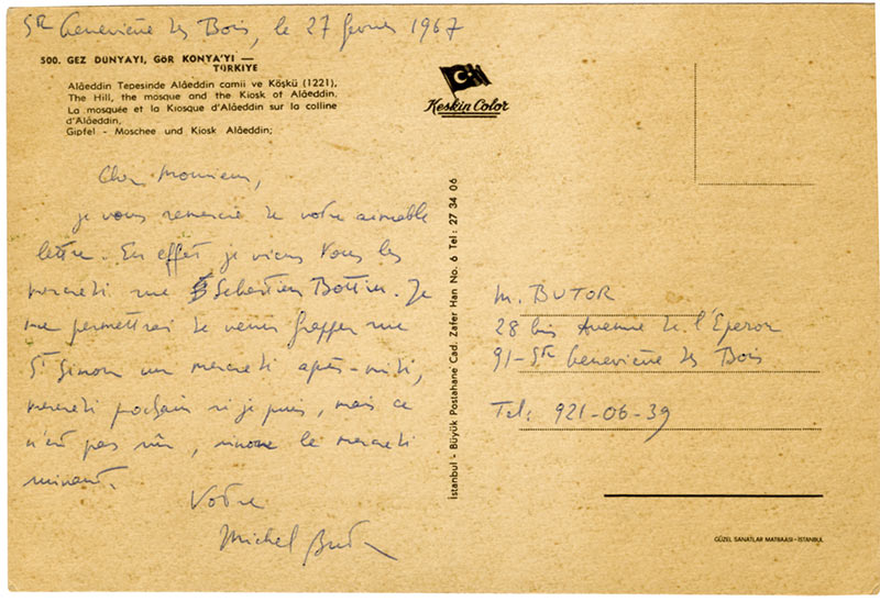 Carte autographe signéeCarte autographe signée, adressée à Michel Moy. Sainte-Geneviève-des-Bois, 27 février 1967 ; 1 page in-12 oblongue. Il le remercie pour son aimable lettre. « En effet je viens tous les mercredis rue Sébastien Bottin. » Il lui promet...