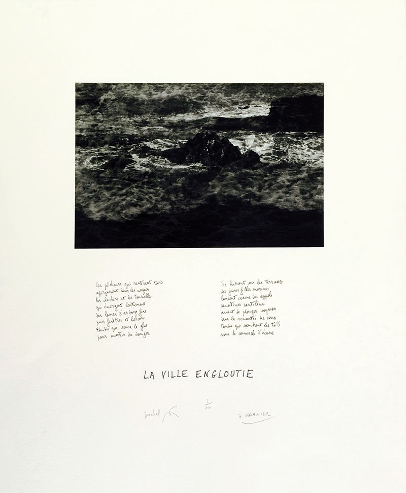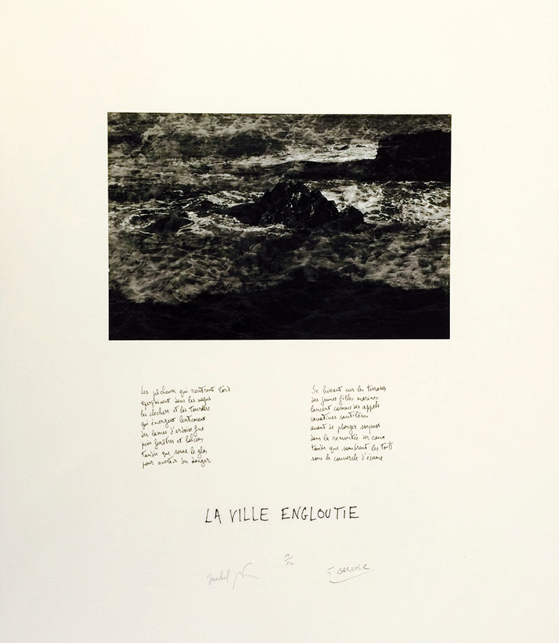 Poème autographe signéPoème autographe signé « La ville engloutie », écrit à l’encre de Chine avec un stylo Rotring sur page d’Arches, sous une photographie originale de François Garnier. 2004 ; 50 x 42 cm; 12 exemplaires numérotés (11/12)....