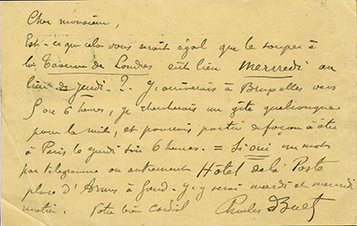 Carte autographe signéeCarte autographe signée, adressée à M. G. Eckhoud. 31 mars 1890 ; 1 page in-12, adresse timbrée au dos. ...