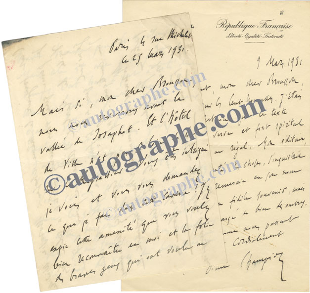 Lettres autographes signéesEnsemble de 5 lettres autographes signées, adressées à Jean Cayrol : 19 décembre 1928 ; 2 pages in-4°. « Une expression sur un visage. Le visage ne fut-il quentier ne peut suffire à renseigner sur un être. Javais perçu sur...