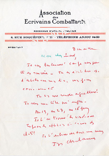 Lettre autographe signée, adressée à Paul GuthLettre autographe signée, adressée à Paul Guth. Paris, 5 mai 1975 ; 1 page in-8°, enveloppe timbrée jointe. En-tête imprimé « Association des Écrivains Combattants ». « Je suis bouleversé car je sais que tu es sincère. Tu as...