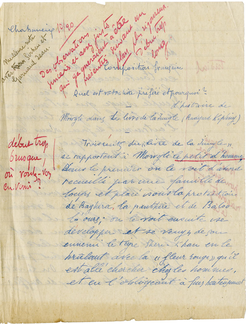 Manuscrit autographe signé.Manuscrits de jeunesse. « Composition française. Quel est votre livre préféré et pourquoi ? » Manuscrit autographe signé. Sans date [Vers 1924] ; 5 pages 1/2 in-8°. Manuscrit à l’encre bleue, corrigé à l’encre rouge par le...