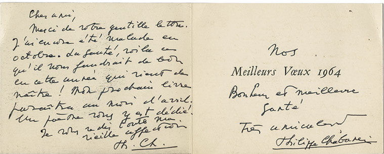 Carte autographe signéeCarte autographe signée, adressée à M. Talbot. [1964] ; 2 pages in-8°, oblongues. « Merci de votre gentille lettre. J'ai encore été malade en octobre. La santé, voilà ce qu'il nous faudrait de bon en cette année qui vient de...