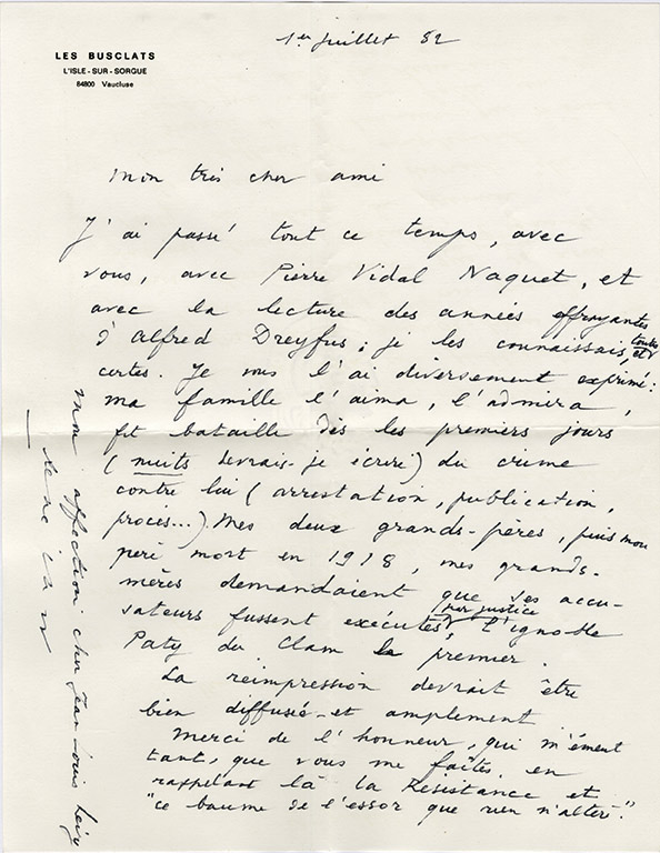 Lettre autographe signéeLettre autographe signée, adressée au docteur Jean-Louis Lévy. 1er juillet 1982 ; 1 page in-4°. En-tête imprimé « Les Busclats », enveloppe timbrée jointe. ...