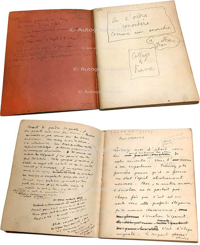 Manuscrit autographe.Manuscrit autographe « De l’ordre considéré comme une anarchie ». 64 pages ; 165 X 240 mm dans un cahier. Allocution prononcée au Collège de France, le jeudi 3 mai 1923. C’est un vibrant hommage à Radiguet qui venait de publier...