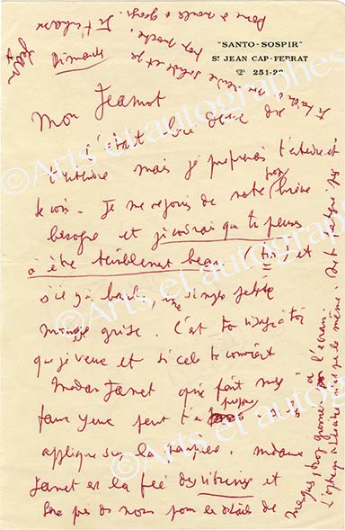 Lettre autographe signée, adressée à Jean Marais, avec un dessinLettre autographe signée, adressée à Jean Marais, avec un dessin représentant la tête d’Œdipe. Santo-Sospir, St Jean Cap-Ferrat [1959] ; 2 pages in-8°.Pendant le tournage du Testament d’Orphée.« Mon Jeannot chéri, nous...