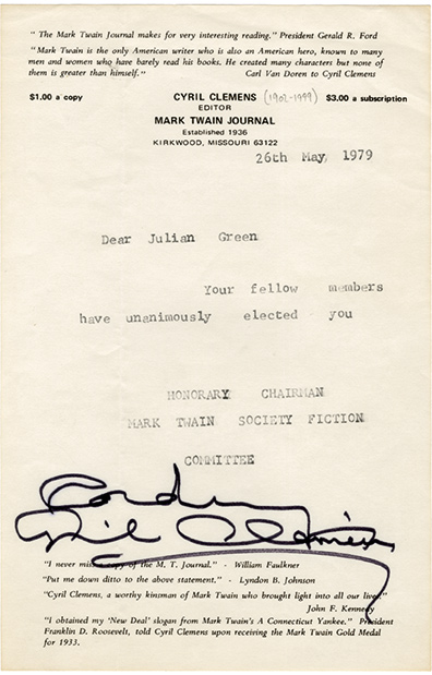Lettre autographe signéeLettre signée, adressée à Julien Green. 26 mai 1979 ; 1 page in-8°. En-tête imprimé « Mark Twain Journal ».Il lui annonce quà lunanimité des membres, il est élu à la présidence du comité de fiction de la Société Mark...