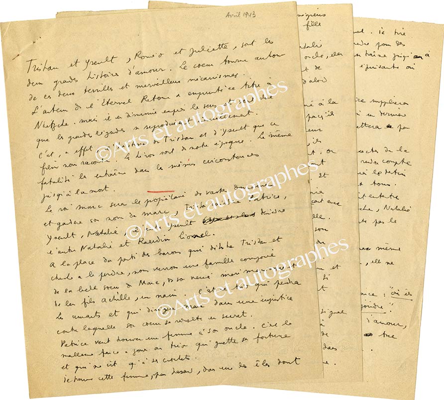 Manuscrit autographe « L’Eternel Retour », signé de l’étoile (et un début de signature biffé)Manuscrit autographe « L’Éternel Retour », signé de l’étoile (et un début de signature biffé). [Avril 1943] ; 3 pages in-4°. Le film L’Éternel Retour révéla Jean Marais et en fit une star.« Tristan et Yseult, Roméo et...