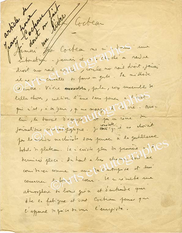 Manuscrit autographeManuscrit autographe intitulé « Jean Cocteau ». 1 page in-4°. Manuscrit dicté par la voix de Jean Marais à Jean Cocteau : « Jamais Jean Cocteau ne m’a donné une intonation - jamais il n’a cherché à rendre droit mon rail...
