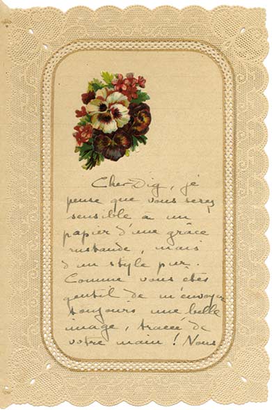 Lettre autographe signéeLettre autographe signée au peintre André Dignimont. [1939] ; 2 pages in-8°, sur papier ajouré façon canivet avec ornement floral (chromolithographie) collé en tête.Colette adorait ces papiers parus au début du siècle, elle en...