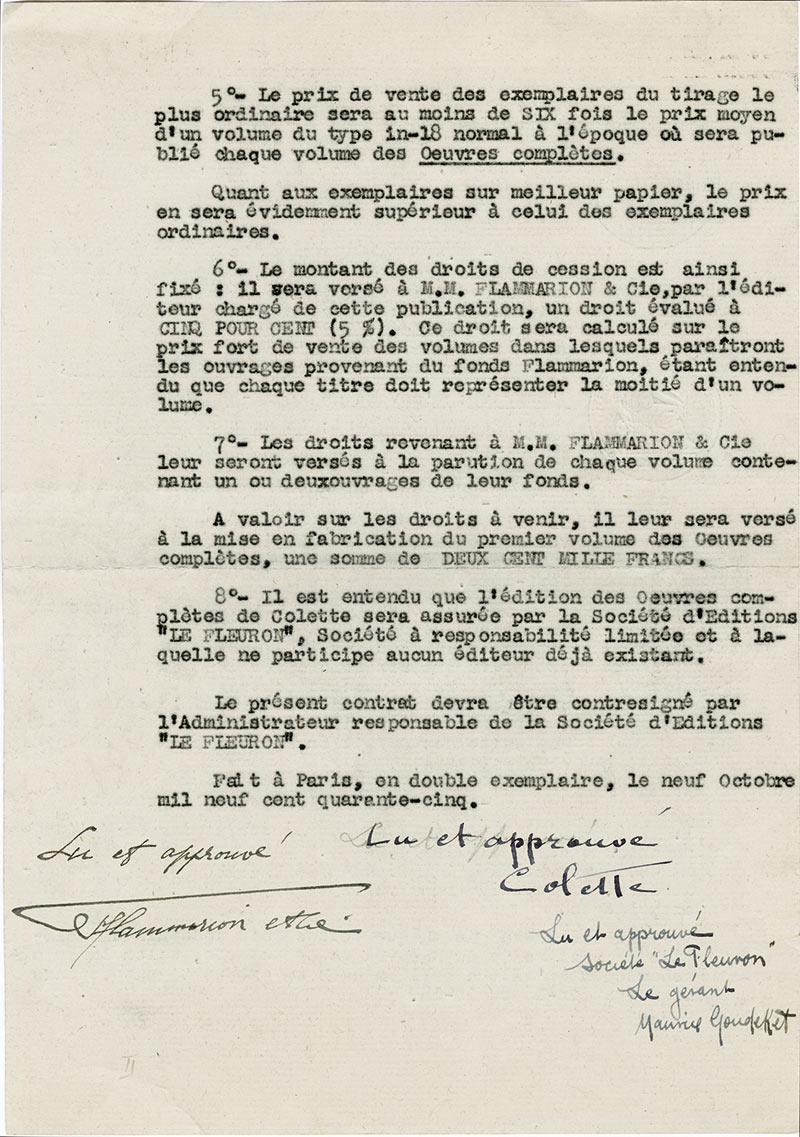Pièce signéePièce signée. Paris, 9 octobre 1945 ; 2 pages in-4°. Contrat signé entre Colette et Les éditions Flammarion . « MM. Flammarion & Cie cèdent à Madame Colette le droit de publier, dans la collection de ses oeuvres complètes, à...