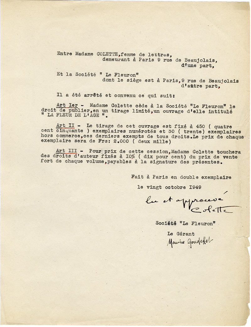 Pièce signéePièce signée. Paris, le 20 octobre 1949 ; 1 pages in-4°. Contrat signé entre Colette et la société Le Fleuron, représentée par Maurice Goudeket. « Madame Colette cède à la société Le Fleuron le droit de publier, en un tirage...