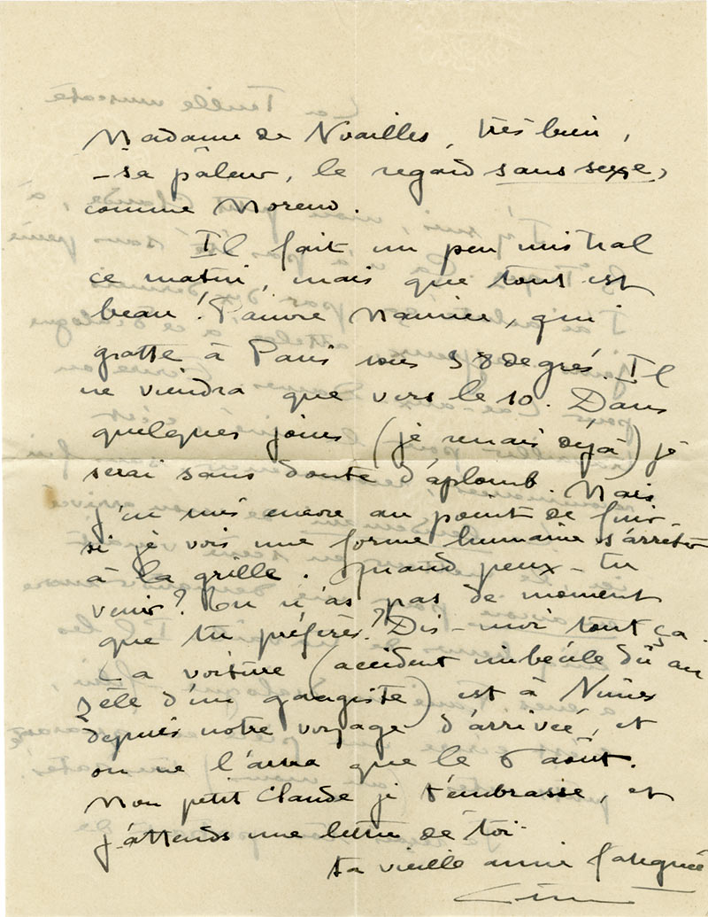 Lettre autographe signéeLettre autographe signée, adressée à Mlle Claude Chauvière, sa secrétaire et amie. [Saint-Tropez, 30 juillet 1930] ; 2 pages in-4°, enveloppe timbrée jointe.« J’y suis, mon petit Claude, à St Tropez. Ça n’a pas été sans...
