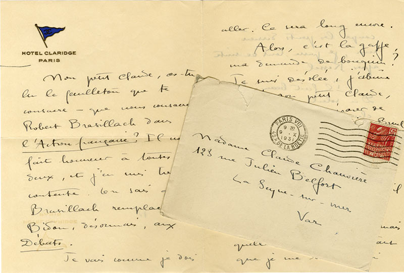 Lettre autographe signéeLettre autographe signée, adressée à Mlle Claude Chauvière, sa secrétaire et amie. Paris, 9 octobre 1931 ; 3 pages in-8° sur le papier de l’hôtel Claridge à Paris, enveloppe timbrée jointe.« Mon petit Claude, as-tu lu le...