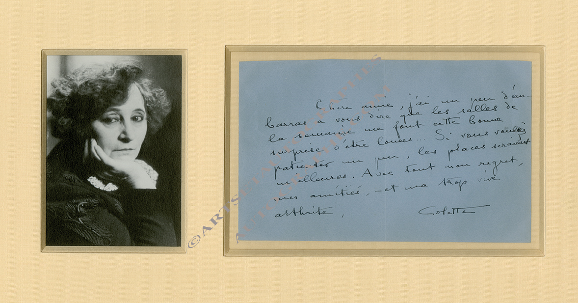 Lettre autographe signéeLettre autographe signée, adressée à son amie Misz Hertz, épouse de Léopold Marchand, l’adaptateur de Chéri et La vagabonde. Sans date ; 4 pages in-4°, sur feuilles de couleurs différentes. Très belle lettre : « Notre...