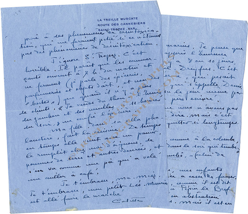 Lettre autographe signéeLettre autographe signée, adressée à « Mon petit Léo » [Léopold Marchand, l’adaptateur de Chéri et La Vagabonde]. Sans date ; 3 pages in-4°, sur papier bleu avec en-tête « La Treille Muscate ». Belle lettre : « Je souhaite...